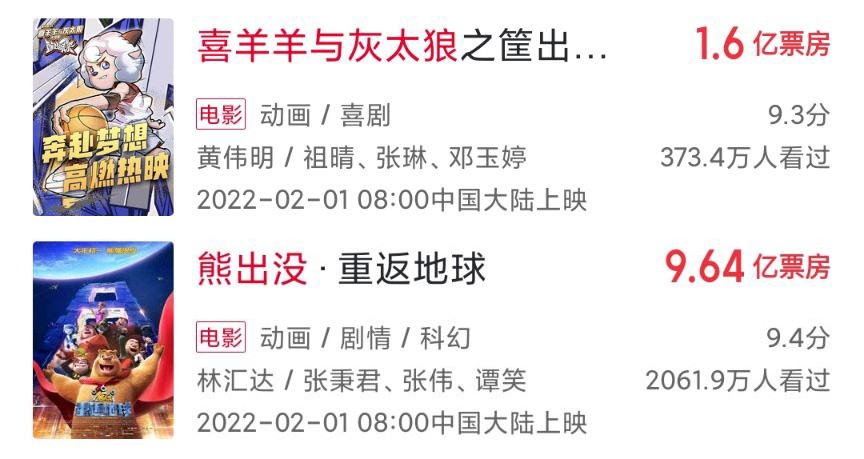 事实也确实如此,鉴于不同时代主流观影平台不同,这里就不对比羊熊二者的剧集收视率了,单就今年同时上映的两部动画大电影就能看出谁是当今国产动画界的王者——