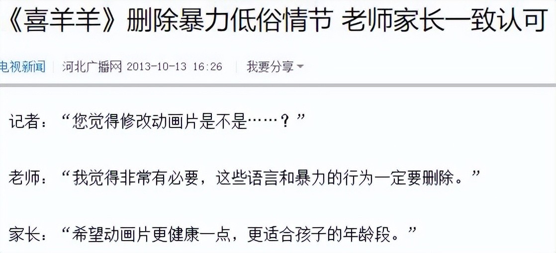 再加上个别家长的发声举报,同年10月,央媒就点名报道了“国内个别动画存在暴力失度、语言粗俗现象”一事,要求「喜羊羊」「熊出没」进行内容整改。