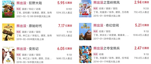 顺带一提,「熊出没」前几部大电影的成绩也非常不俗,最低都是2亿票房起步。