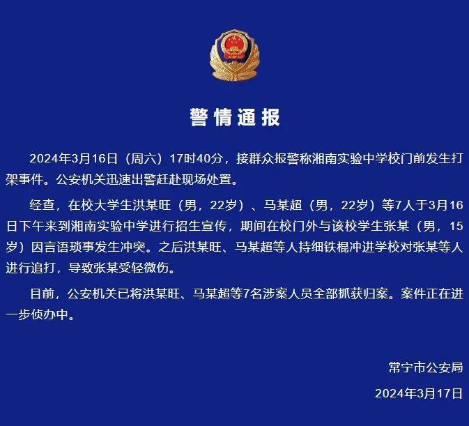 据湖南常宁市公安局通报:2024 年 3 月 16 日(周六)17 时 40 分,接群众报警称湘南实验中学校门前发生打架事件。公安机关迅速出警赶赴现场处置。