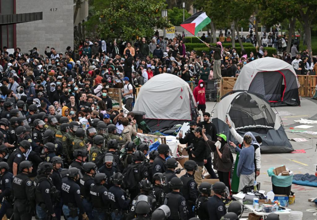 5 月 15 日,一群挺巴抗议者短暂占领并封锁了加州大学尔湾分校(UCI)的一栋教学楼,导致该校数周以来一直容忍的抗议活动升级,随后大学采取了行动。