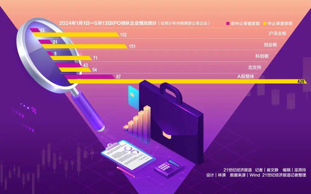 截至 5 月 14 日,除去新撤材料的项目,由大华所担任中介机构的在会 IPO 项目多达 38 个,包括 33 个中止审查项目、3 个证监会注册项目、1 个问询回复项目和 1 个已受理项目。