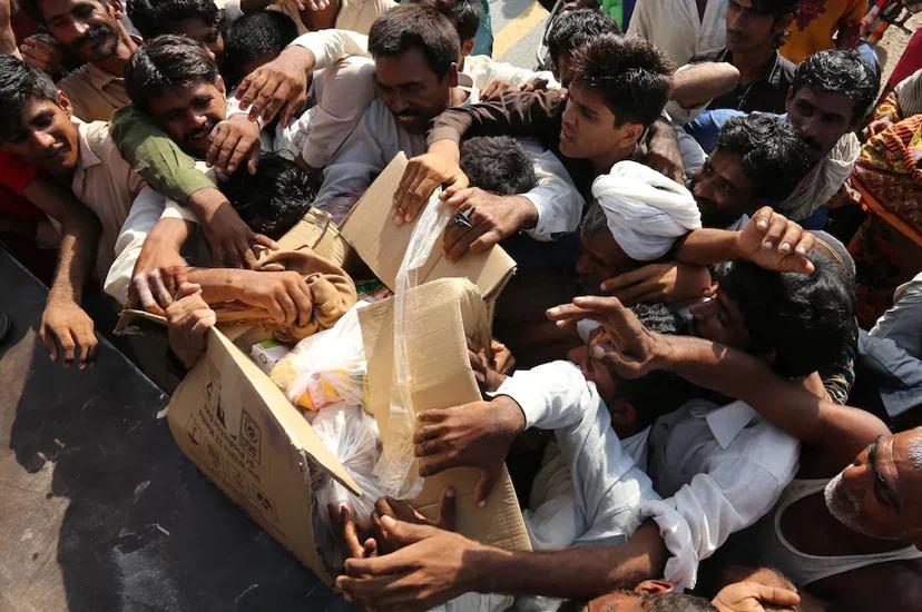 巴基斯坦旁遮普省灾民争抢救济粮。图源:wp