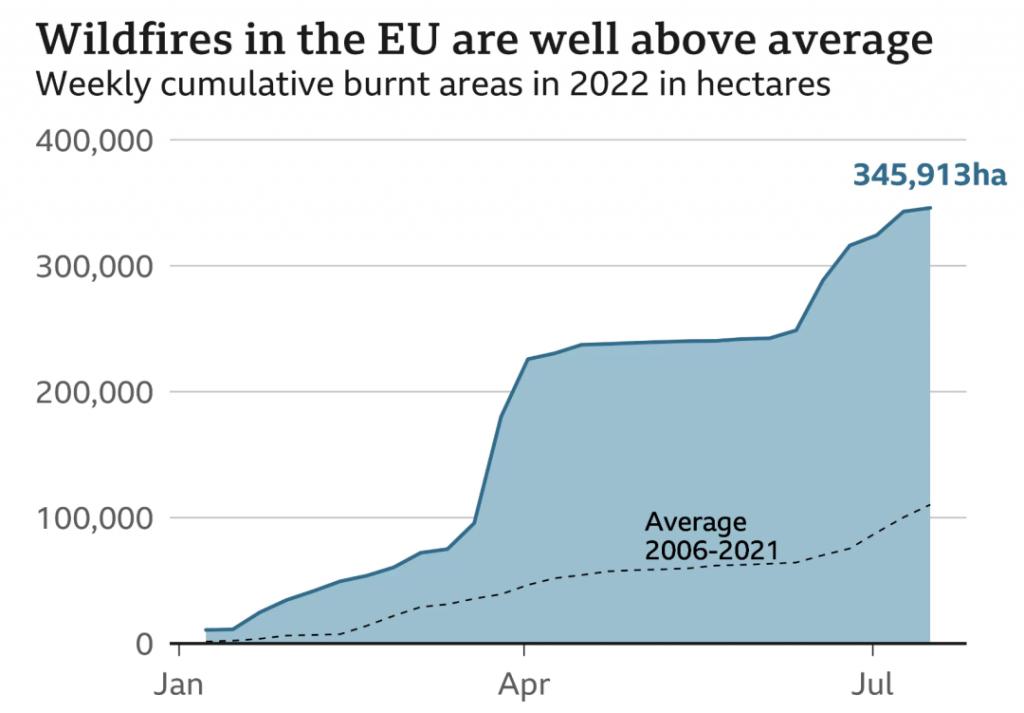 不仅是中国,在这个夏天,欧洲的野火也 " 异军突起 ",蔓延面积达到了十五年来平均值的 3 倍。