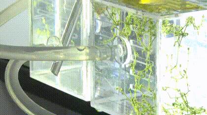 在问天实验舱,科学家专门构建了以斑马鱼为研究对象的小型密闭生命生态系统。这个密闭的 " 水族箱 " 中约有 1 升多水、四五条斑马鱼,还有些藻类和微生物。斑马鱼呼出二氧化碳给藻类进行光合作用、吃食物排泄的粪便给金鱼藻进行营养供给,藻类产生氧供给斑马鱼,这对组合就构成了一个自给自足的生态循环系统。