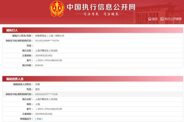 中国执行信息公开网显示,近日,钟薛高食品(上海)有限公司及其法定代表人林盛被限制高消费,执行法院为上海市嘉定区人民法院。关联案件流程显示,此前,该公司已成被执行人,执行标的 81.81 万元。此外,该公司旗下分支机构已全部注销。