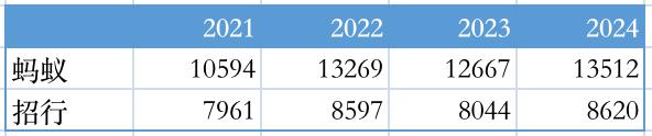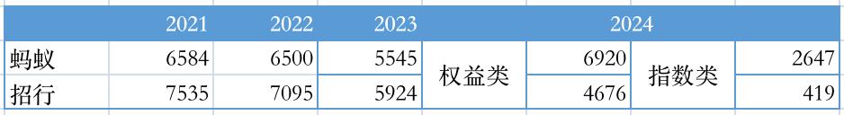 招行方面,股票 + 混合公募基金保有规模从 2025 年时的超 7500 亿规模,下滑到了约 4000 亿元——新口径中的权益类减去指数类粗略可与股票 + 混合相类比。蚂蚁方面,则从超 6500 亿元,也下滑到了约 4000 亿元。两者的下滑幅度都非常明显。