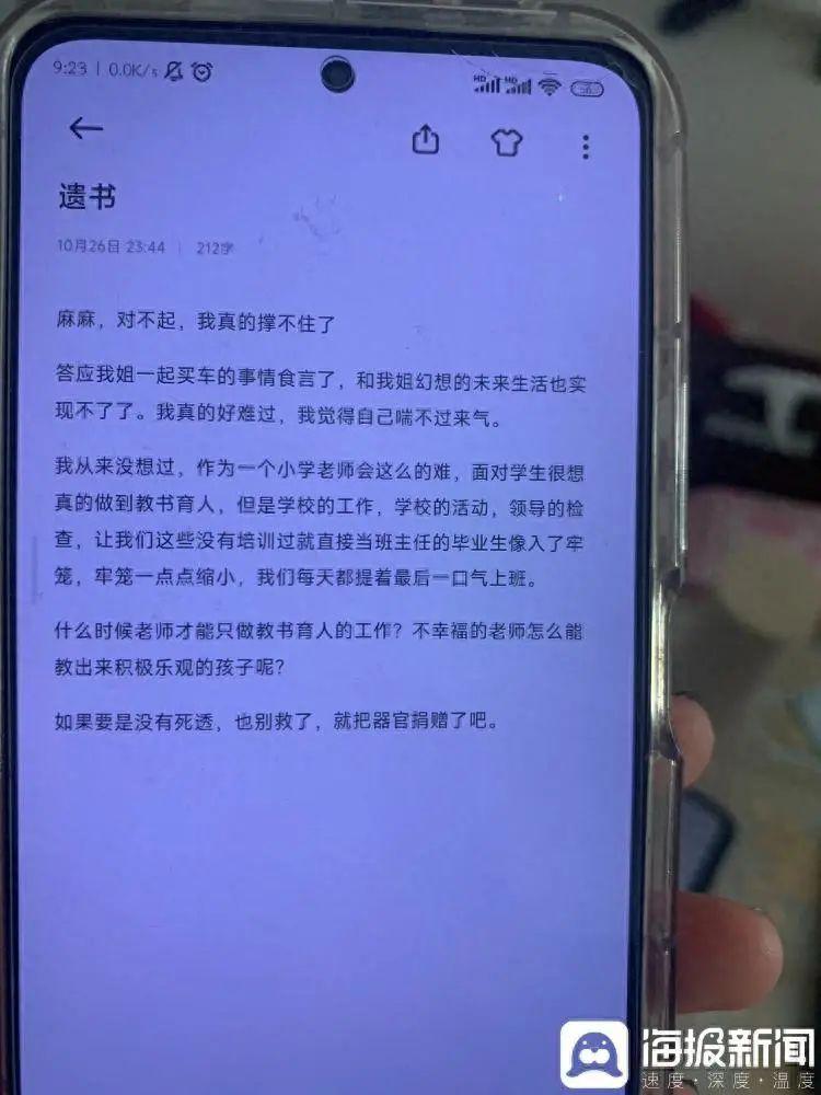 妹妹跳楼自杀后,她从警方那里拿回妹妹的手机,发现妹妹 26 日当晚自杀前于 23:44 写了一份遗书,遗书中称 " 真的撑不住了 "" 好难过,我觉得自己喘不过来气 "" 从来没想过,作为一个小学老师会这么的难 "……