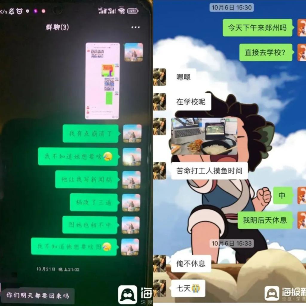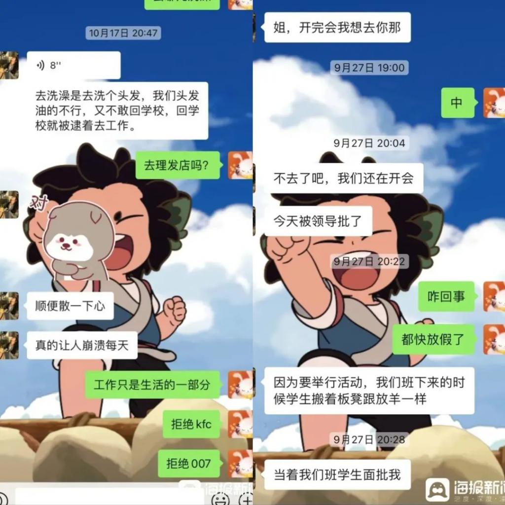吕女士给记者提供的聊天记录中显示,妹妹在 9 月 27 日晚上 8 点称 " 还在开会 "" 被领导批评了 "" 当着我们班学生面批我 ";10 月 6 日下午提到 " 在学校 ""7 天 "" 不休息 " 等;10 月 11 日,她给姐姐发信息说 " 昨晚凌晨一点才回宿舍,真不容易 ";10 月 17 日晚上,她在聊天中跟姐姐吐槽 " 我们头发油的不行,又不敢回学校,回学校就被逮着去工作 "" 真的让人崩溃每天 "。