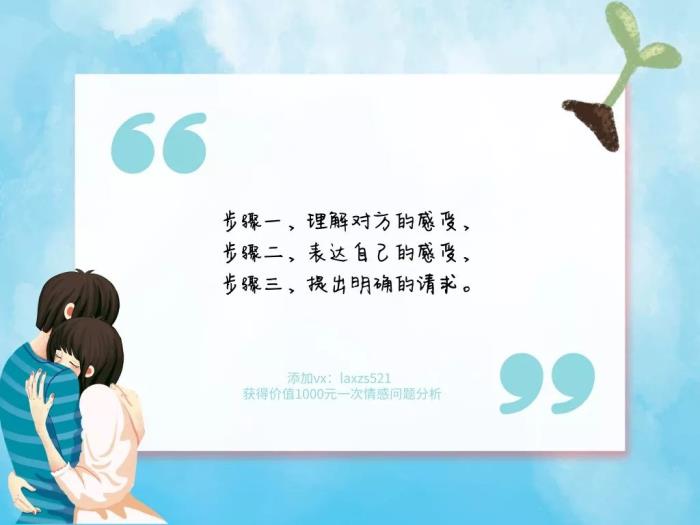我们来举个例子:“亲爱的,我觉得你最近工作压力很大,我理解你回到家就很累,所以我们聊天有点少,看到你这么累的时候我会很担心你,我想你能不能找一个时间主动的跟我说一说你现在遇到的问题。我想能够更多的去帮助到你,你看这个礼拜三晚上,可以吗?”
