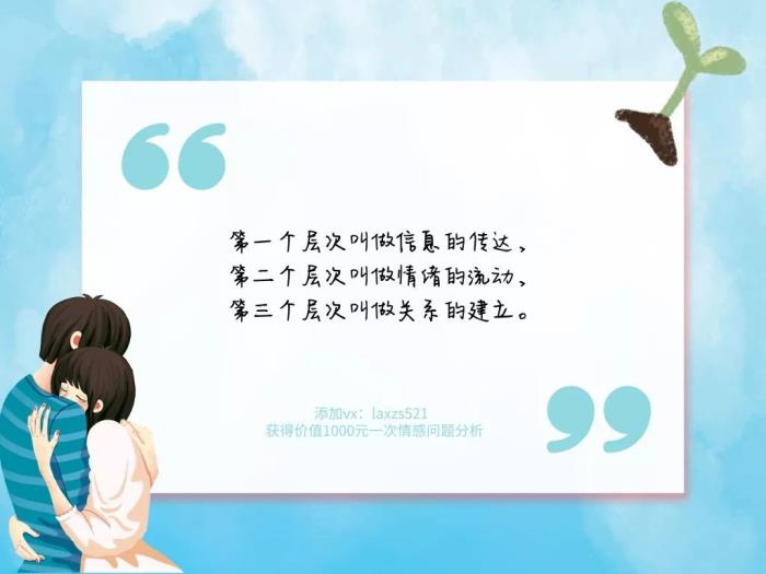 第三层次的沟通是“不沟通”,我和你在一起,我们可以什么都不说,但是彼此相处很舒适。这个层次的沟通就是建立了稳定的和舒适的关系。