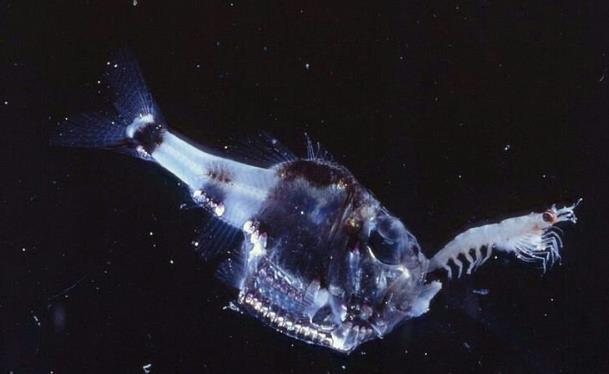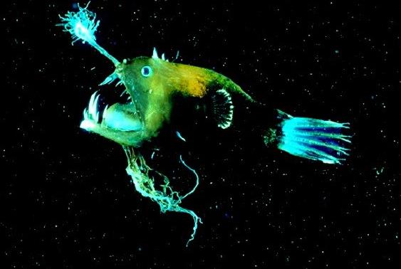 海洋中到处是发光物体:蛤鱼、鱿鱼、海绵、细菌都在黑暗中闪闪发光,它们多达 1100 种,其中会发光的鱼有 240 多种,它们多数栖于深海,少数栖于浅海,主要分布在 200~1000 米深的微光带。