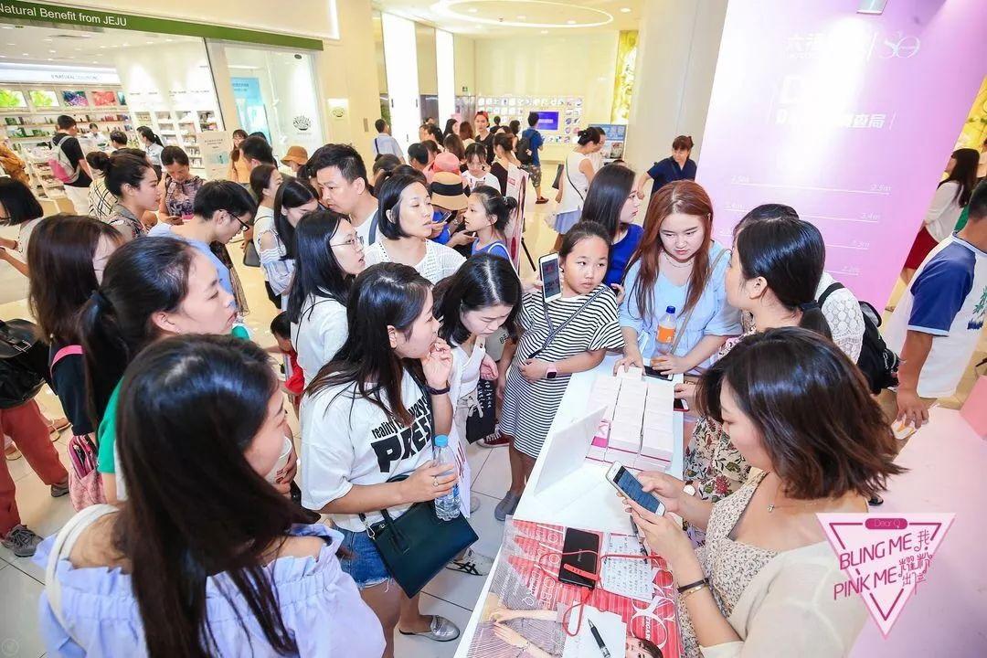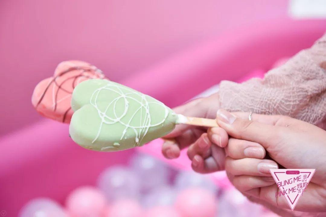 在拍照互动区的墙面上有Slogan装点, “Bling Me, Pink Me我耀粉出位”“Give My Heart To You””把整颗心都给你”“闪耀少女力”“C位耀满分”等关于爱的态度宣言牌。