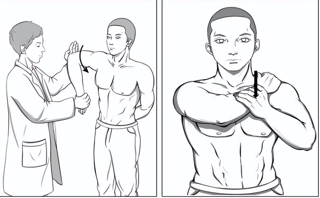 图2 改良Hawkins-Kennedy试验(a):在Hawkins-Kennedy试验的基础上将患者上臂内收内旋,从而减小喙肱间距;Yokum试验(b):患者将患侧手置于对侧肩上,健侧手置于肘弯处向下方用力,患者则用力等长收缩抵抗,如果疼痛出现或再现即为阳性。