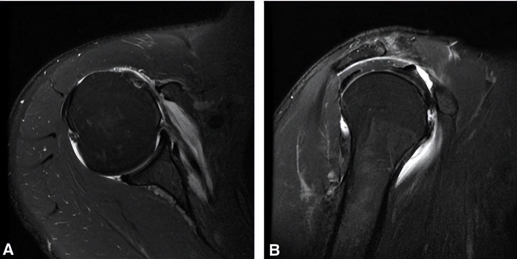 图3 轴向(a)和矢状位(b)MRI能够显示狭窄的喙肱间距及肩胛下肌腱损伤以及局部炎症。