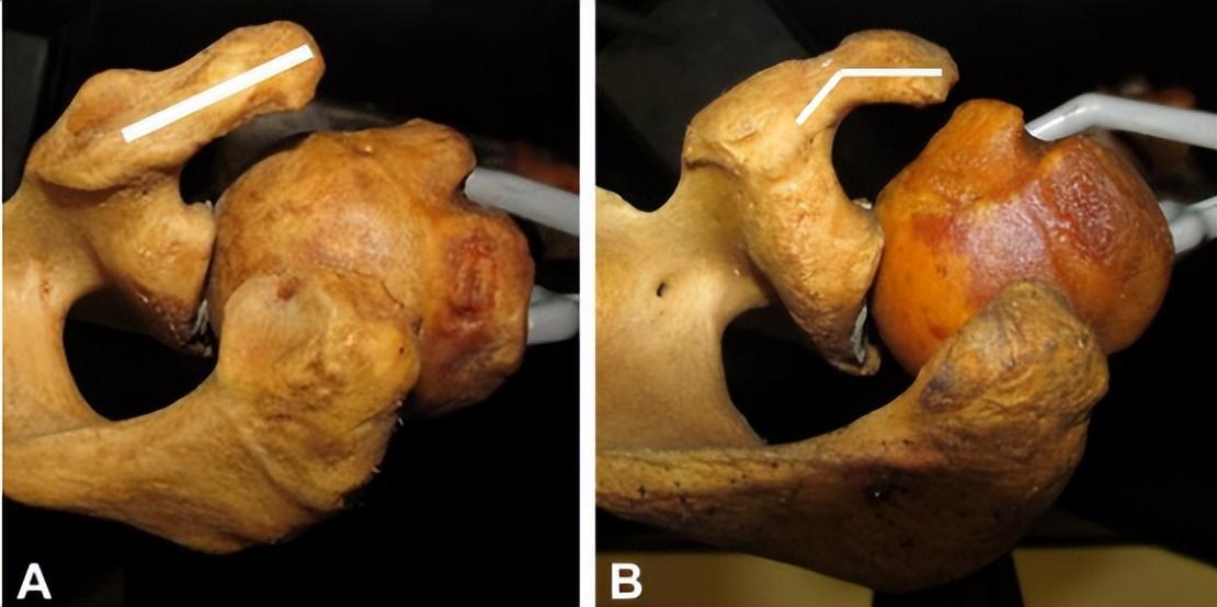 图1 喙突的不同形态:扁平状(A);钩状(B)