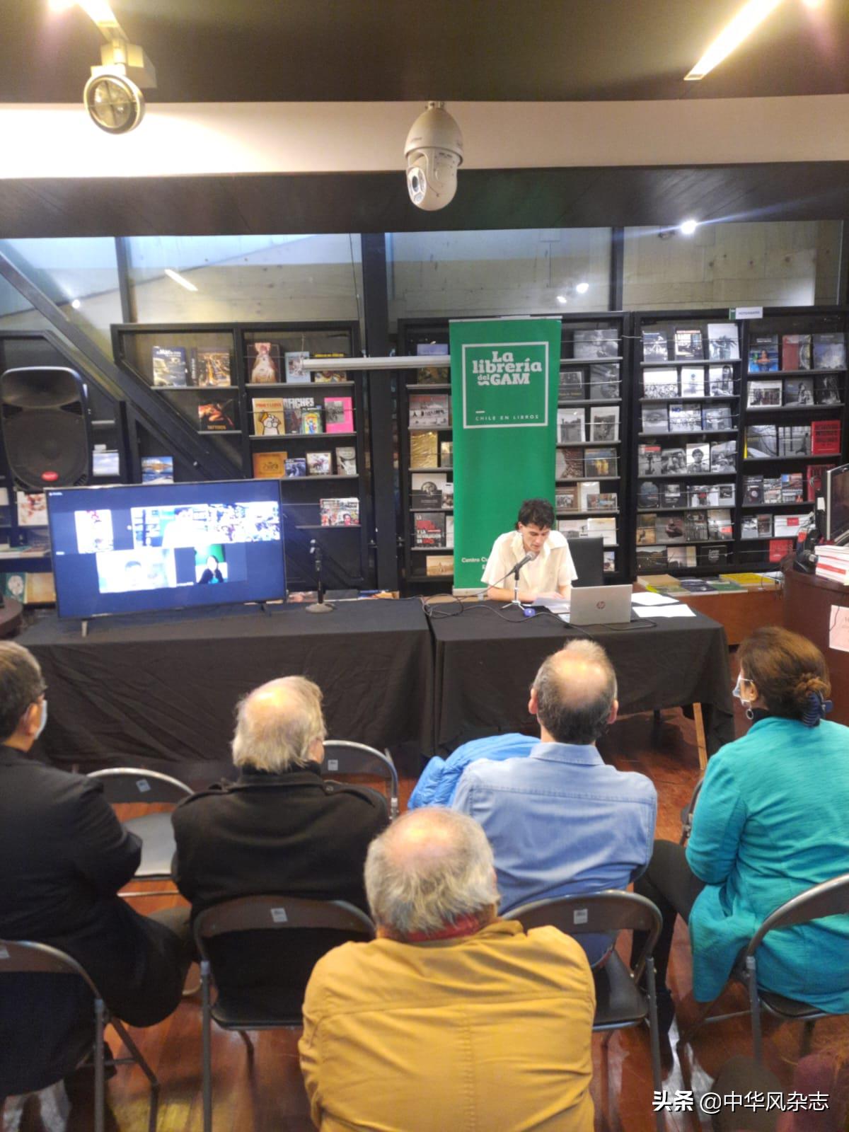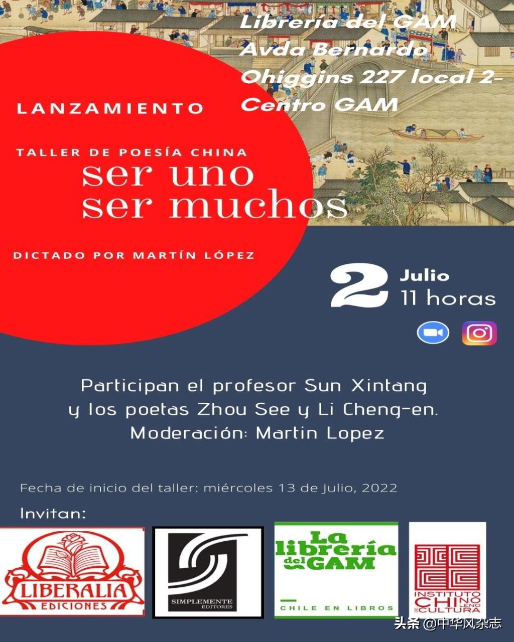 智利“中国诗歌工作坊”由智利米斯特拉尔中心书店、辛普雷门特出版社、书之地出版社、智中文化协会“中国文学读者俱乐部”主办。本次诗会的主持人是智利著名诗人马丁·洛佩斯;辛普雷门特出版社社长、中心书店总经理莫妮卡致欢迎词;智利前驻华大使、智中文协主席马塔教授在活动结束时致辞;现场协调与翻译为北京语言大学拉丁美洲研究中心主任、阿根廷国会大学教授孙新堂。