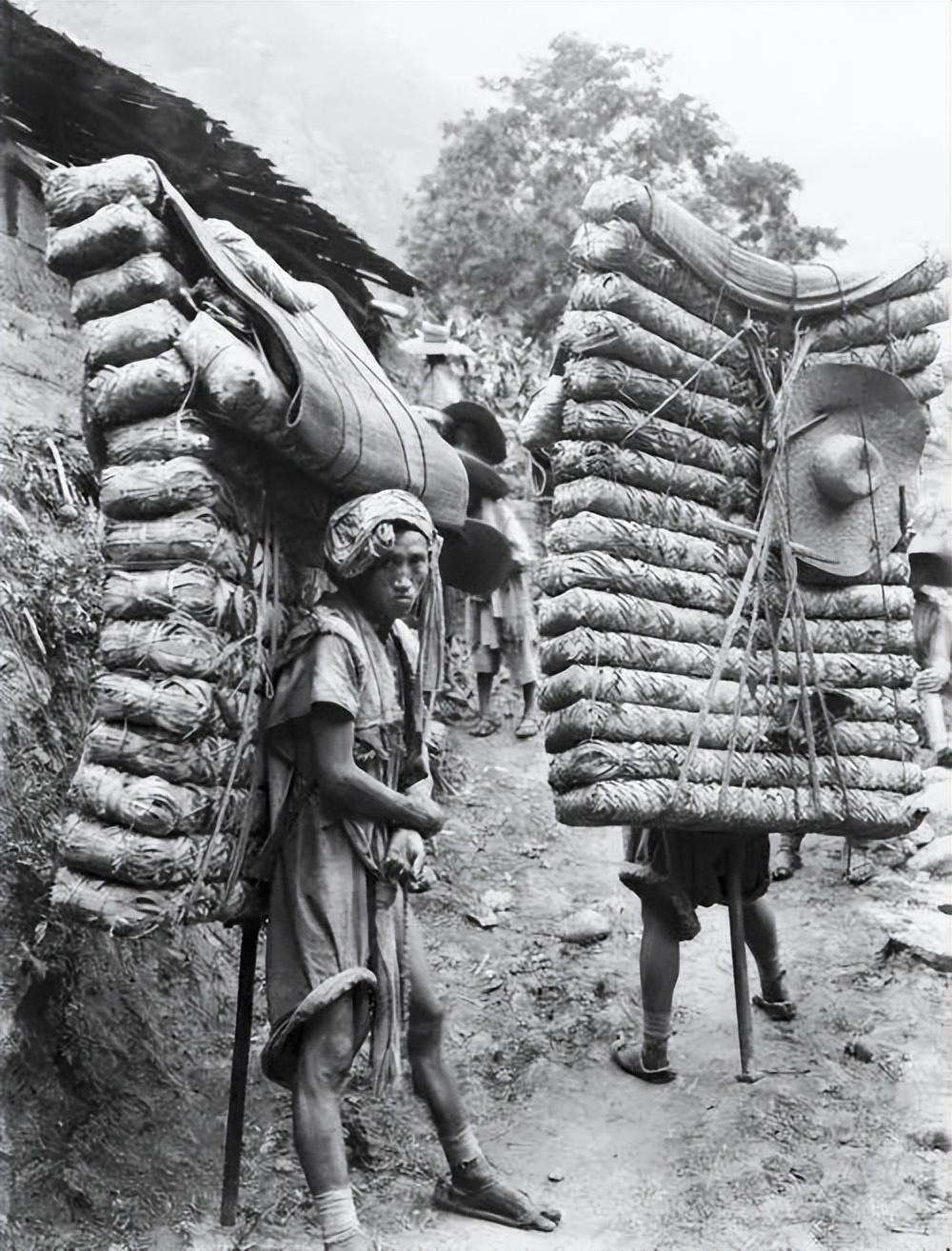 ▵川藏线上茶马古道的茶背子,背着重量约300斤的砖茶,在雅州和康定之间的山道上。照片拍于1908年。