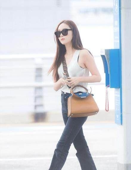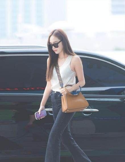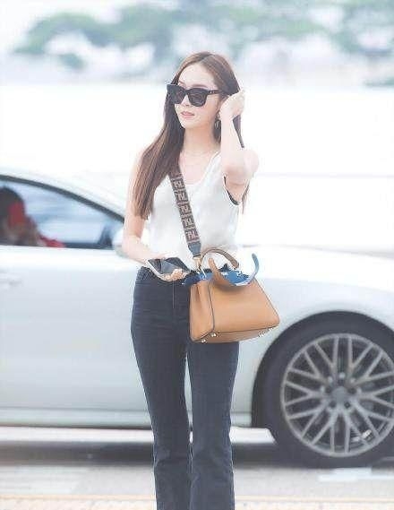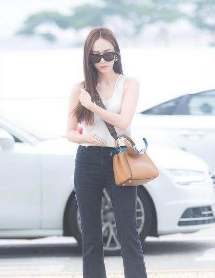 搭配黑色阔腿牛仔裤非常的摩登时尚,高腰的设计更显郑秀妍身材高挑,喇叭裤的设计拉长了郑秀妍身高给人的视觉感,让身高162cm的郑秀妍看起来有“一米八”的感觉。