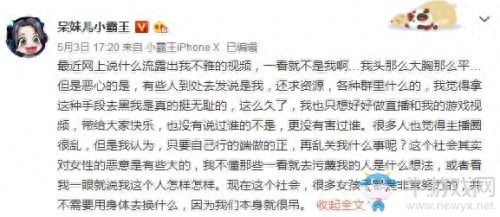 最近网上说什么流露出我不雅的视频,一看就不是我啊…我头那么大胸那么平…但是恶心的是,有些人到处去发说是我,还求资源,各种群里什么的,我觉得拿这种手段去黑我是真的挺无耻的,这么久了,我也只想好好做直播和我的游戏视频,带给大家快乐,也没有说过谁的不是,更没有害过谁。很多人也觉得主播圈很乱,但是我认为,只要自己行的端做的正,再乱关我什么事呢?这个社会其实对女性的恶意是有些大的,我不懂那些一看就去污蔑我的人是什么想法,或者看我一眼就说我这个人怎样怎样。现在这个社会,很多女孩子都是非常努力的,并不需要用身体去换什么,因为我们本身就很吊。