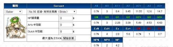 配卡AABBQ,hit数分别为蓝卡3,红卡1,绿卡3,EX攻击4,拥有3hit的蓝卡,NP率还是不太残疾的0.7%,而且有予天繁星技能的加成NP充能速度飞快(尤其在蓝卡队中有狐嫁的加成下尤为明显)。