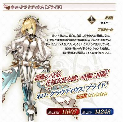 尼禄·克劳狄乌斯(花嫁),嫁尼禄,白色暴君,花嫁,嫁王,滑稽,在这个充满了各种给给 比如某剑阶四星单体蓝宝具的从者 人物世界里,尼禄无论是装束、武器还是宝具特效都显得极其华丽这次更是直接身着婚纱登场(婚纱正是女孩子的战斗服啊!),不管是在原著FE还是在你游FGO中,都有着独特的魅力和超的人气。
