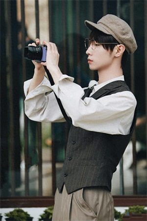 这一身小西装的穿搭,真的很有贵气公子的感觉,以白色衬衫作为内衬,搭配西装夹克,暗色系的条纹更能凸显出文艺,再加上眼镜的点缀,一种儒雅的斯文气息扑面而来,当举起相机的那一刻,时间瞬时定格,将容颜与时代在瞬间留住。
