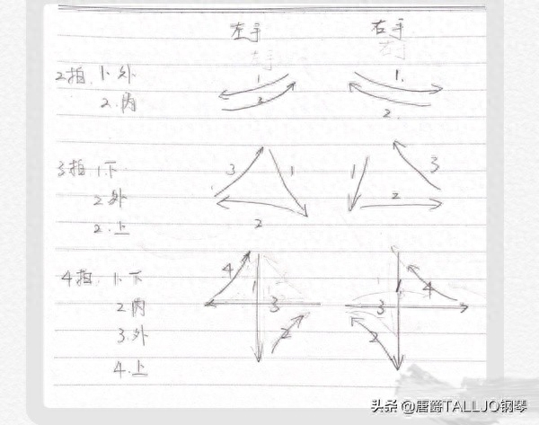2、这里的二拍三拍四拍并不是完全对应拍号的,例如2/4拍用二拍打法,而6/8拍也经常用二拍打法,每大拍包含三小拍,或者有时6/8拍打小拍的话,就使用四拍打法。