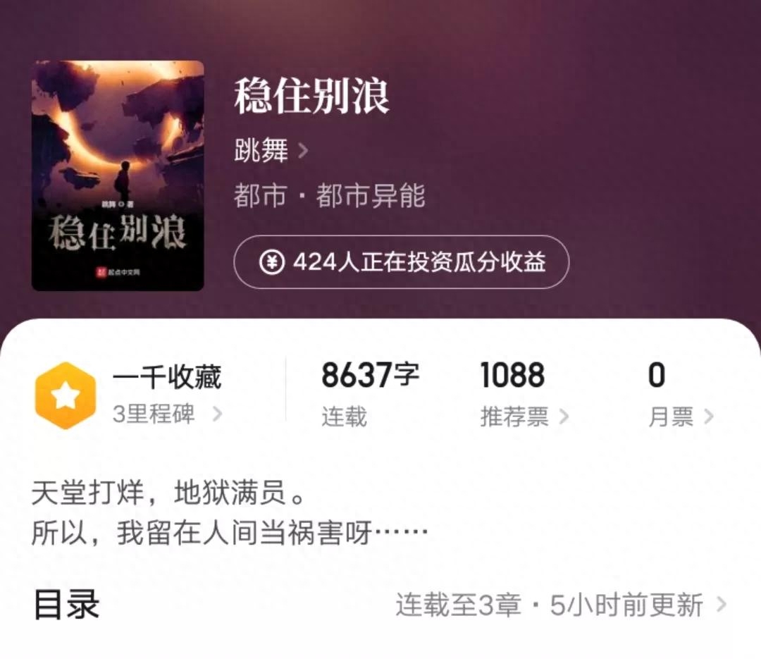 另外随着《天启之门》的完结,跳舞的新书《稳住别浪》也在起点同步上线了。