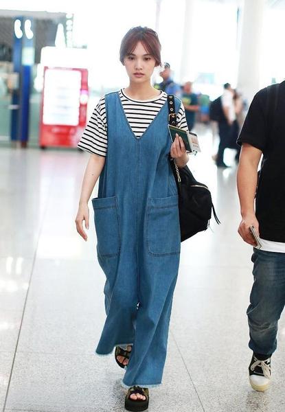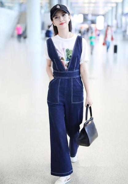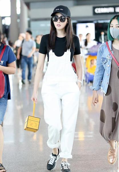 倒过来看一下白色T恤和黑色背带裤,其实效果超不多啦!都是学生感十足的样子,欧阳娜娜这身很是她的个人风格了~