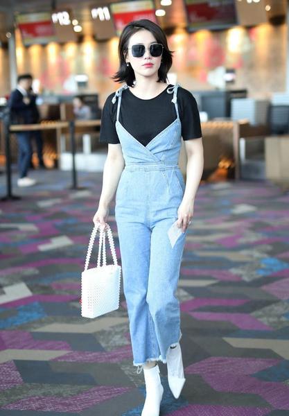 除了蓝色的背带裤,其他颜色也要有姓名啊!同样是黑色T恤,张天爱选择了白色背带裤,脸鞋子都是黑白配色,很彻底了!不过一颗亮黄色的小方包还是很点睛的~