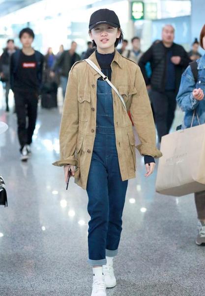 像周冬雨这样的风格背带裤更是应景,这一身虽然没有什么太亮眼的色彩或设计,但是配色超顺眼,舒适感也超强,很有学生味哦!