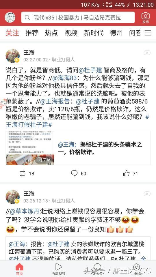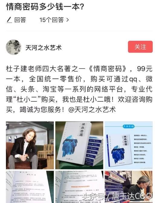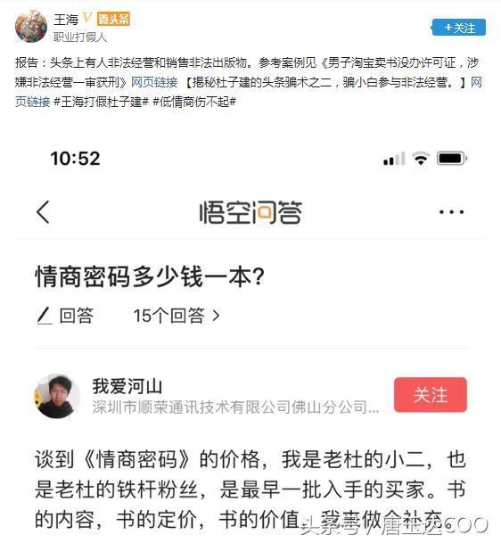 杜子建在微博上玩不下去了,现在换了一个地方,跑到今日头条上来呼风唤雨,忽悠了一群小白,和忠实粉丝。随着粉丝暴涨,之后开始收割,忽悠他的粉丝帮他买书,现在知名打假人王海重点关注了杜子建童鞋。越来越的的阴暗面被揭露了出来。