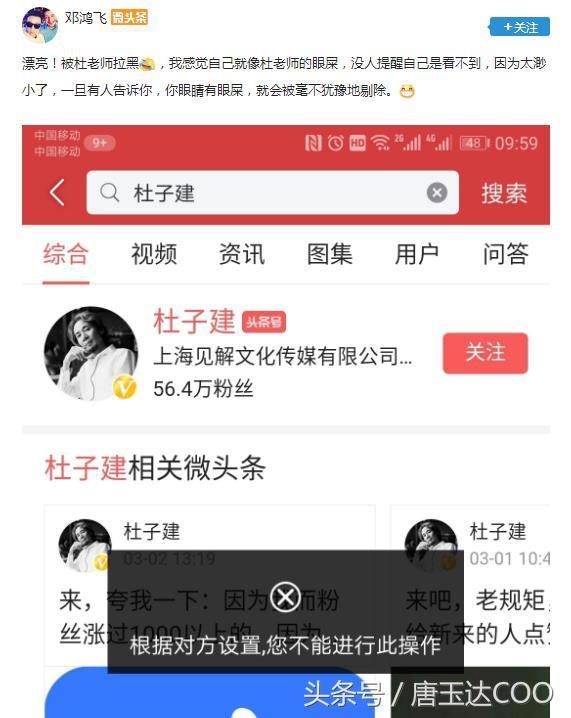 随着不断有清醒的认识不断地写文章,拍视频揭露杜子建的套路,杜子建直接来了个拉黑,让你关注不了。
