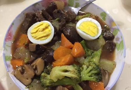 西兰花香菇胡萝卜水煮牛肉,咖喱味,茶叶蛋