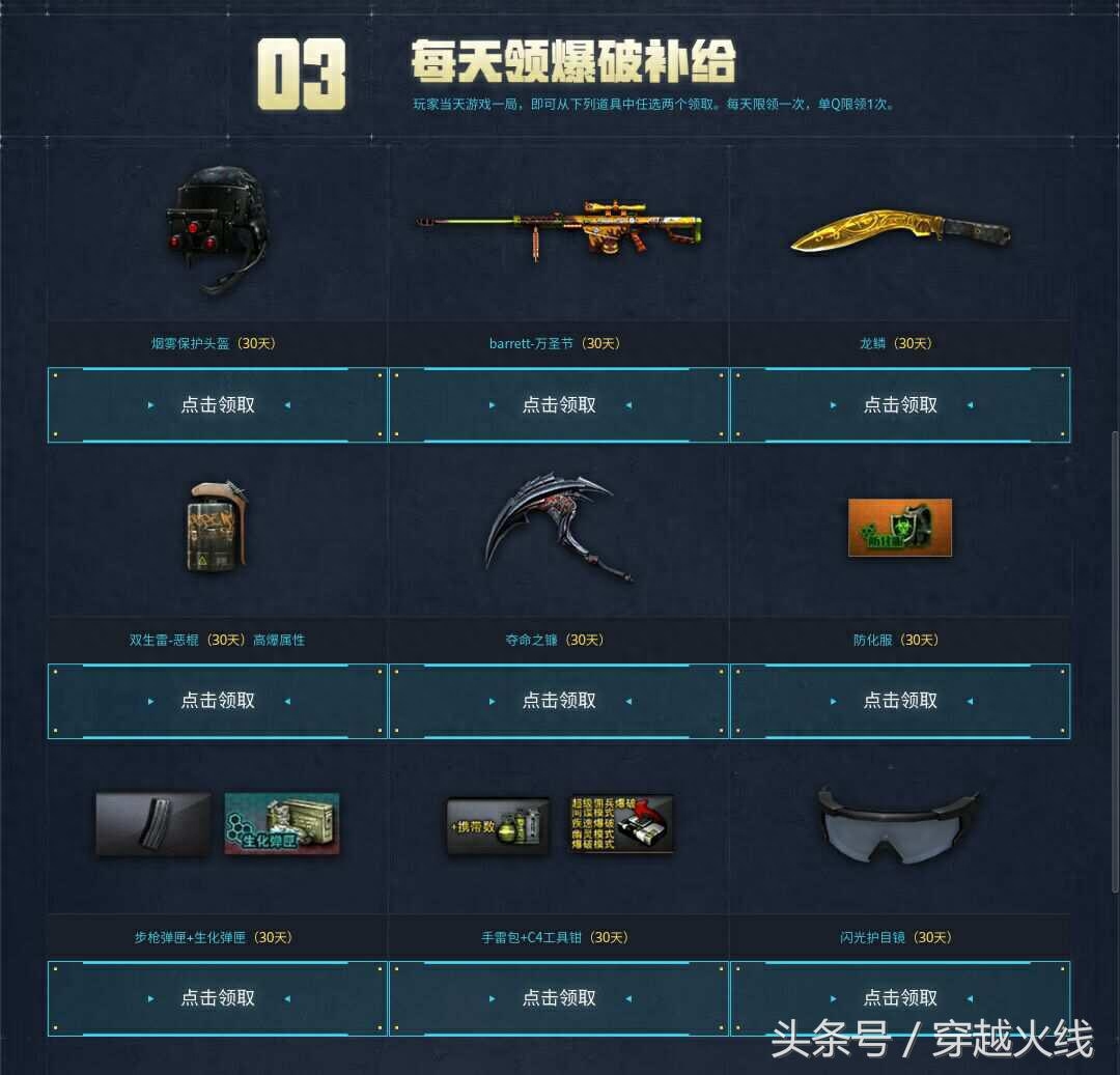 在活动6月1号-6月9号期间,只要玩家每天在线游戏一局,就可以在这九分大礼包里面选取两件自己喜欢的道具,只要每天保持在线,就可以全部带回家的,爆破套装烟雾头和护目镜,弹夹和C4钳子,手雷包和防化服统统送给你,还有非常稀有的龙鳞祝你更加勇猛征战CF~