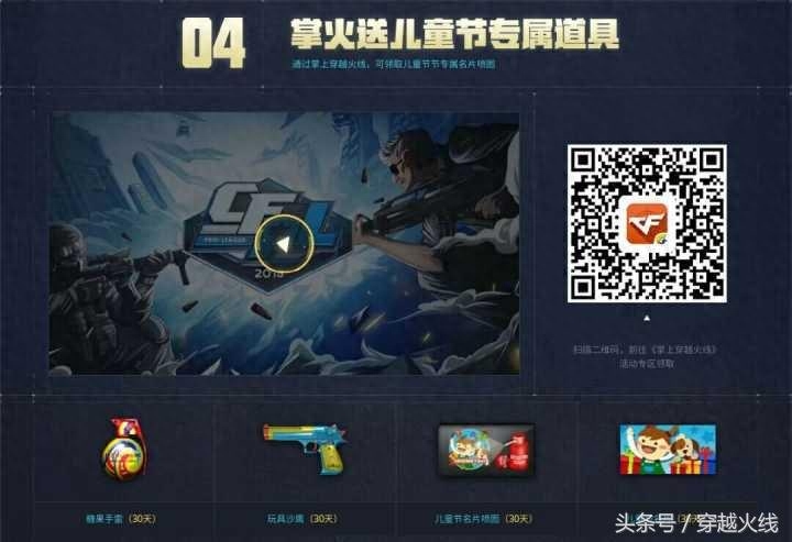 看到这么多豪礼,是不是忘了六月这个特殊的月份,虽然我们已经长大,但是六一也是我们国家的儿童节呢,所以登陆掌火还有专属道具礼品送给你,糖果手雷,玩具沙鹰,儿童节喷涂And儿童节名片,让你在CF游戏的世界里面充满了童真的心灵~~~