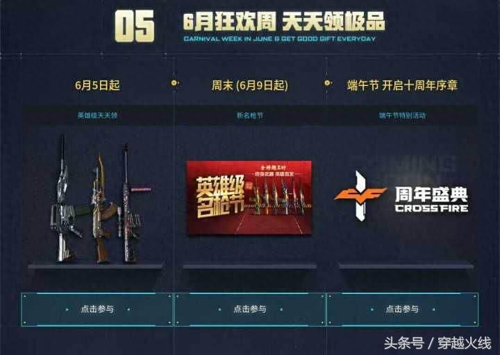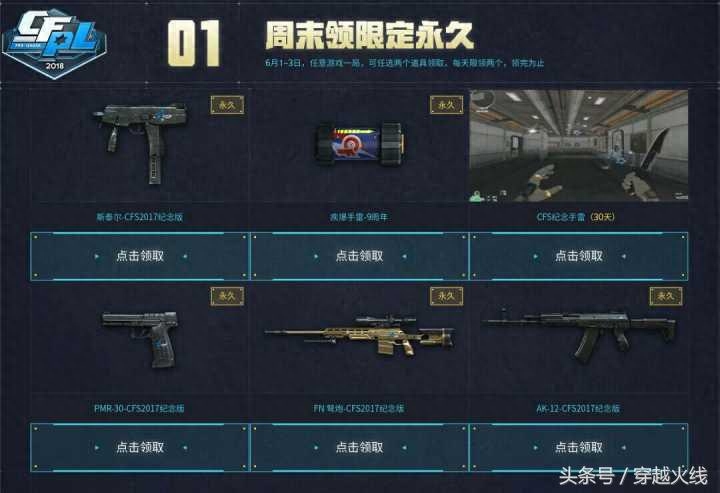 助力总决赛,喜庆十周年,各种好日子即将来临,在6月1日-6月3号,CFS纪念版武器永久发放给你,只要每天在线一局,就可以领取两款CFS纪念版武器,仔细看CFS手雷可是有特殊的爆炸 效果的哦~~~