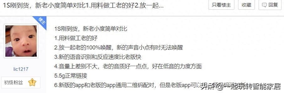 4、因为我没有买小度在家1S,不买的原因下面会说,所以目前没法给大家对比评测小度在家和小度在家1S了。这里借用百度贴吧网友的对比使用的感受,供大家参考吧。