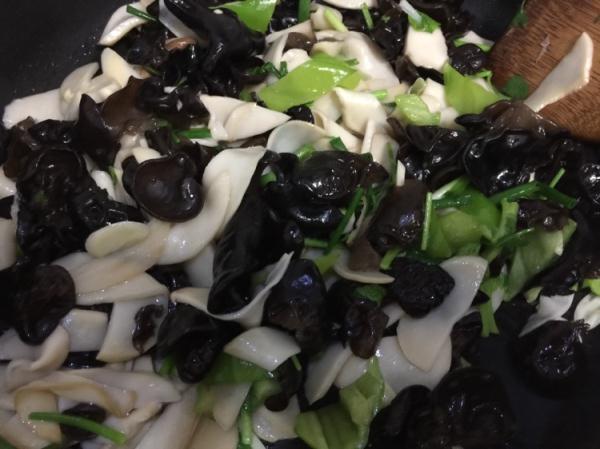 第三步,然后我们将切好的青、红椒段放入锅中快速翻炒,等到断生后,我们再把木耳放入锅中。