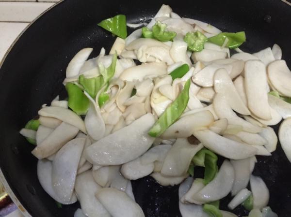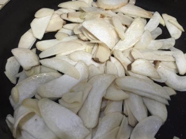 第二步,起锅,在锅中加入适量的油,冷油时将大蒜和杏鲍菇放至锅中进行翻炒,直至杏鲍菇变软。