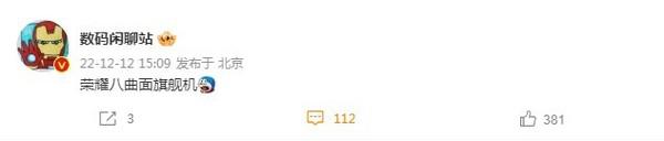 【手机中国新闻】12 月 12 日,据数码博主 @数码闲聊站 爆料,荣耀可能有一款八曲面旗舰机,很大概率就是接下来推出的荣耀 Magic5 系列。