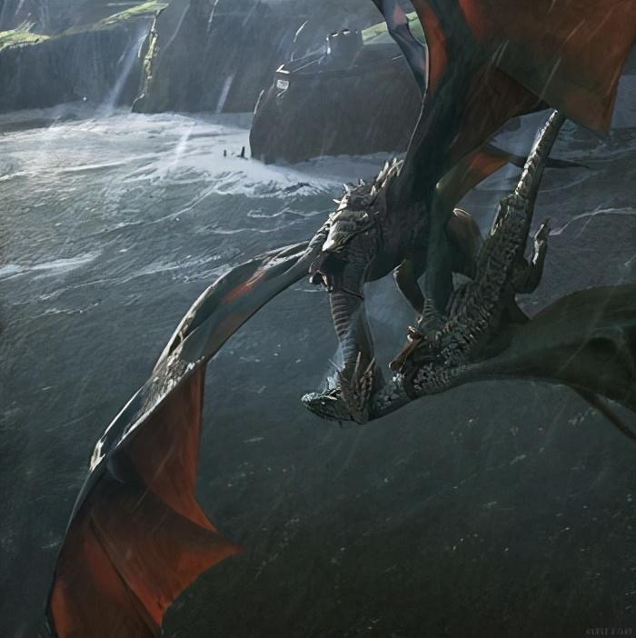 他们是血色天空中两个巨大的黑影,龙焰如此明亮,以至下方观望的渔民害怕云层也会起火燃烧。……科拉克休死死咬住瓦格哈尔的脖子,它的黑牙深陷进老龙的血肉;瓦格哈尔的爪子则扯开了“血虫”的肚皮,牙齿撕裂其一边翅膀。但科拉克休越咬越紧、越咬越深,它们以惊人的速度坠落。