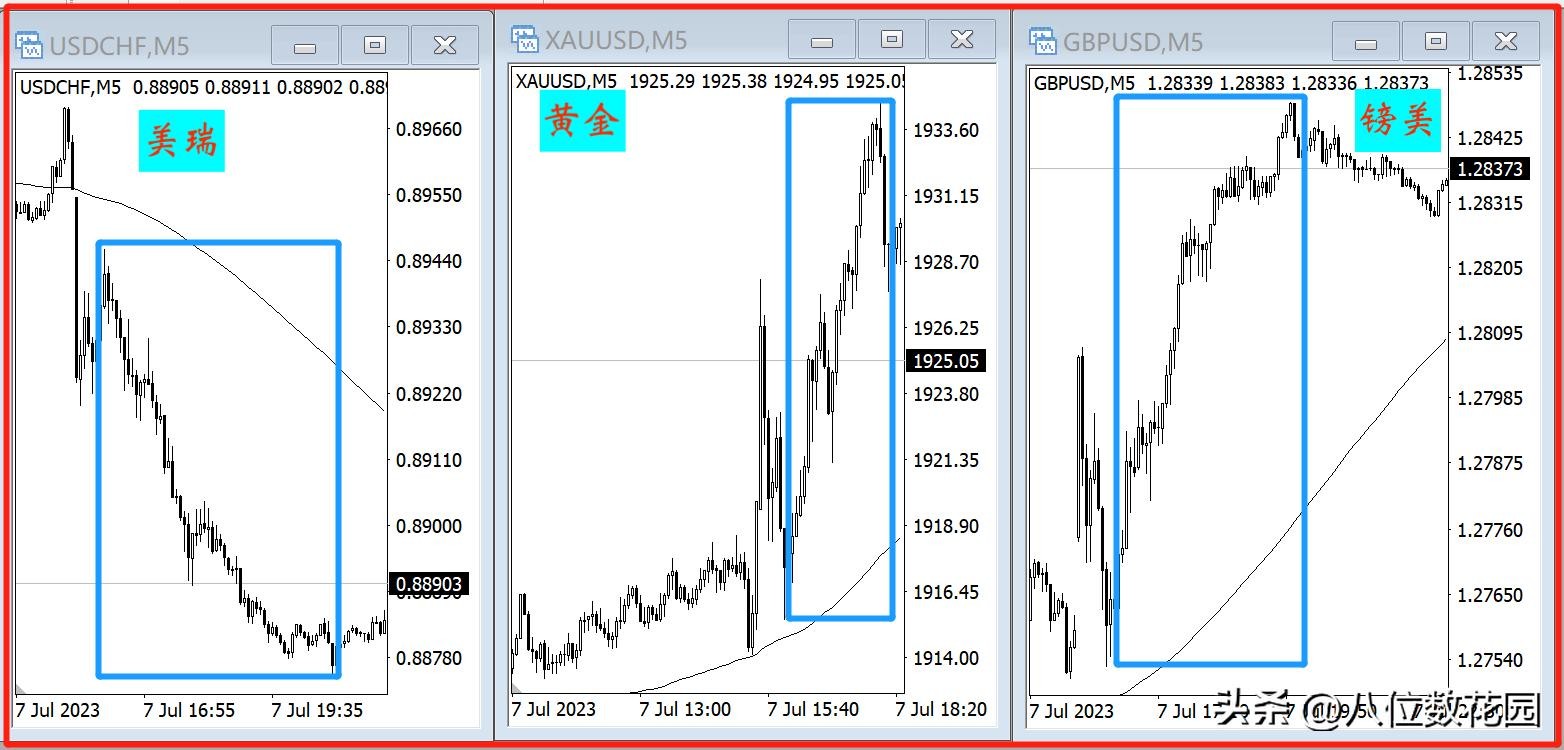 图中是美元兑瑞郎,黄金和英镑兑美元三个品种,在非农之后受数据影响,5分钟的k线截图,我们来对比一下非农数据后,它们的运行空间。