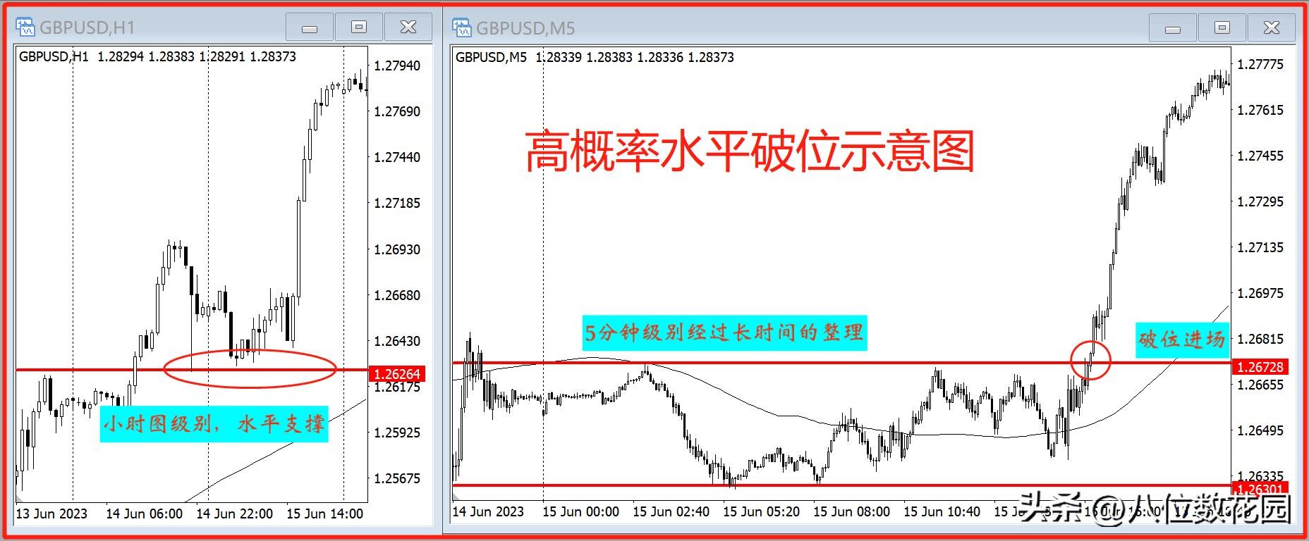 图中是高概率水平破位的示意图,图中左侧是1小时级别的k线,右侧是5分钟级别的k线。