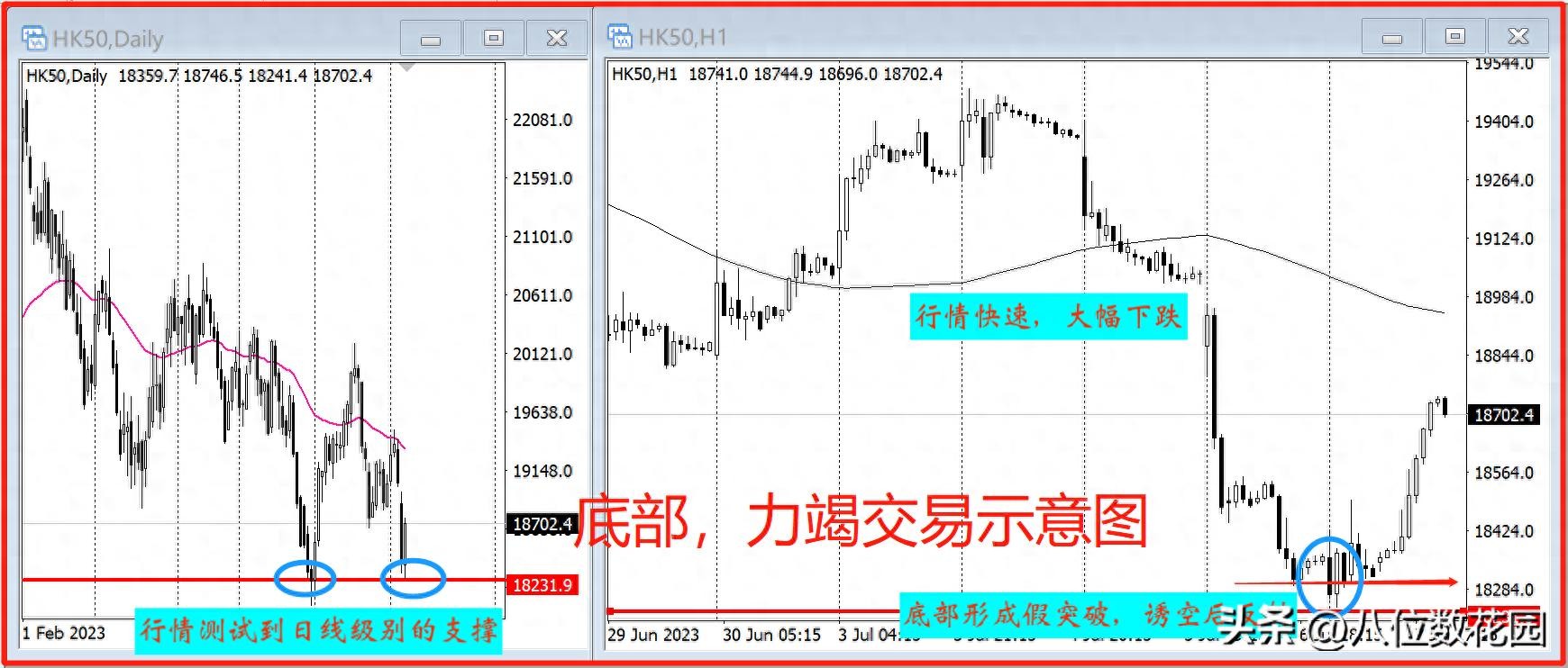 图中是香港恒生指数的k线,图左侧是日线级别的k线,右侧是1小时级别的k线。