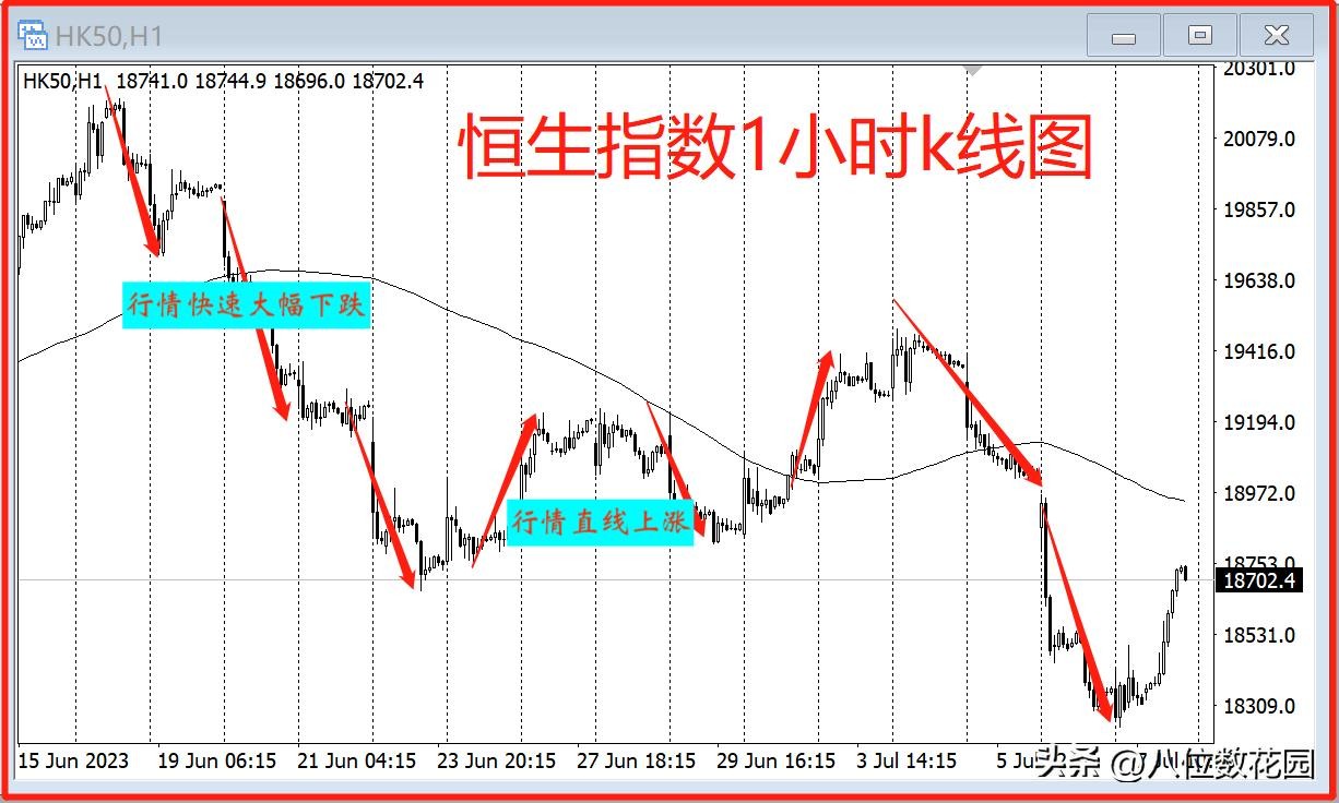 图中是恒生指数1小时级别的k线图。图中有很多近似90度的上涨和下跌,行情运行的空间很大,而且中间的回调非常小。