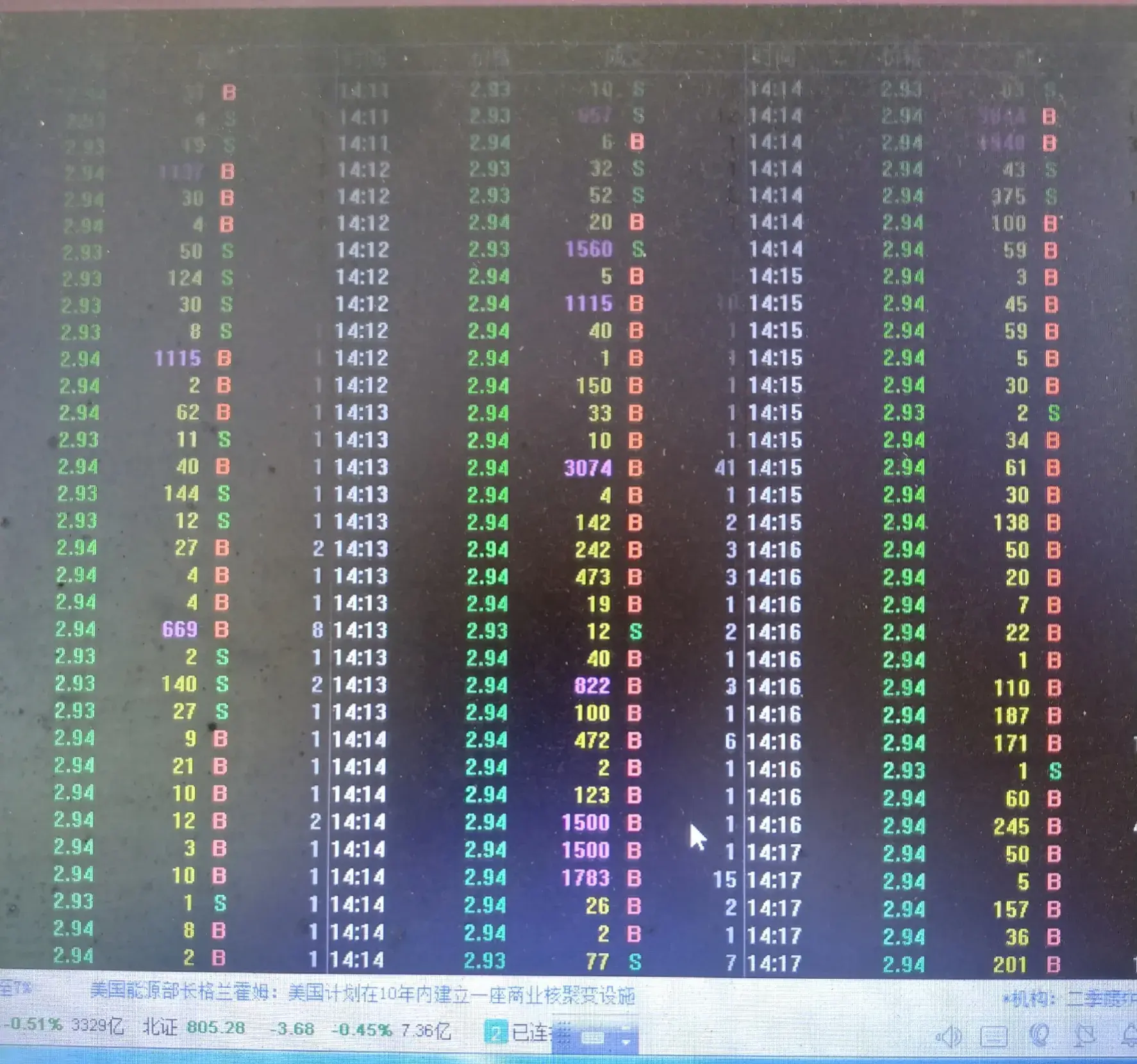 2:00后,空方有两笔共计1.1万手抛出,再次砸破2.94。缩量横盘。2:09后,多方开始连续千手买入。持续性非常好,5分钟千手买进共计2万多手。后面继续百手级别脉冲买进。2:20,多方5千多手再次买上2.94。买一位多方增兵积极。2:30,收2.94,跌1分,换手0.71%,同比昨日缩量1成 ,即时委差绿盘2.9万手。其后,空方有几笔千手、百手单抛出。2:32,空方再次千手单累积万手抛出,再次攻陷2.94。这种单子,都是故意对倒砸破吓人的。榨不出什么油水了,大资金制造恐慌,有枣无枣打两杆子而已。成交量萎缩到两位单主导。主买成交占优。2:42,有一笔5千手买入。无量横盘。2:48 买入占优,但多方明显没有攻击欲望。1:50后,空方有千手级别间歇性抛单。2:51后,百手级别买入略微积极。尾盘,空方又见两笔千手级别抛单。竞合竞价有意低收。最后,顺子全天收在2.93,跌2分。全天换手0.85%,同比昨日继续缩量半成。再收一颗带上影线的小阴,看起来还会继续下探。