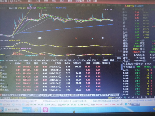 2、岩山。第一笔平显2.95。打下。量很小 。横盘。最后开在2.94,低开一分,成交2468手,同比昨日缩量三分之一。委差略红。盘面基本稳定。