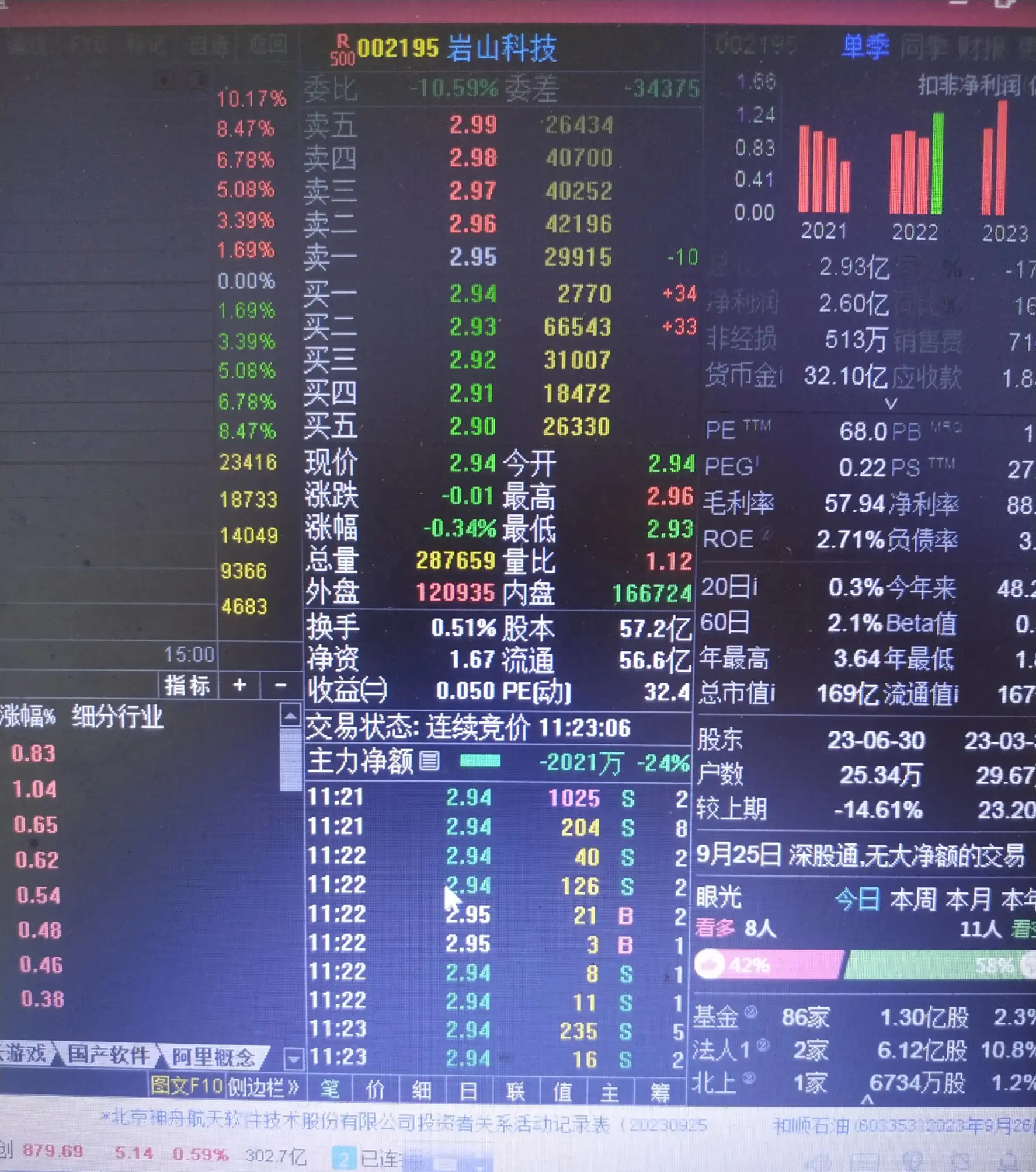 10:00后,继续横盘。量能总体不大,空方抛盘继续占优。10:05,空方再次抛出一笔万手大单。但多方很快还以颜色,10:06,连续千手大单买入,2分钟买进2万多手 成功站上2.95。后面,多空双方均有千手级别脉冲买卖,但没有影响横盘态势。10:12,空方再次砸穿2.95,多方很快收回。2.95反复争夺,多次易手。10:15,多方连续几笔200手单子买入。多方站稳2.95。量能降下 ,成交长时间2位单主导。数字经济与人工智能相关板块今天不错,各细分板块指数基本红盘。互联网、AIGC、游戏等,还在涨幅榜前列。空方上部挂单增加。10:30,收2.96,涨1分,前一个小时换手0.37%。同比昨天基缩量一成。即时委差绿盘3.2万多手。